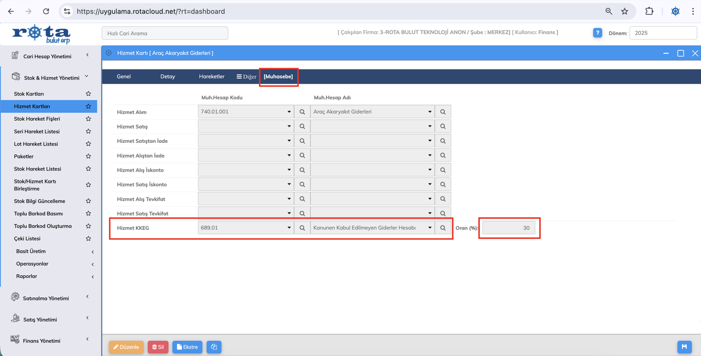 İlgili Hizmet Kartı seçildikten sonra, ekranın en alt kısmında bulunan “Hizmet KKEG” alanından ilgili muhasebe hesabı seçilir.