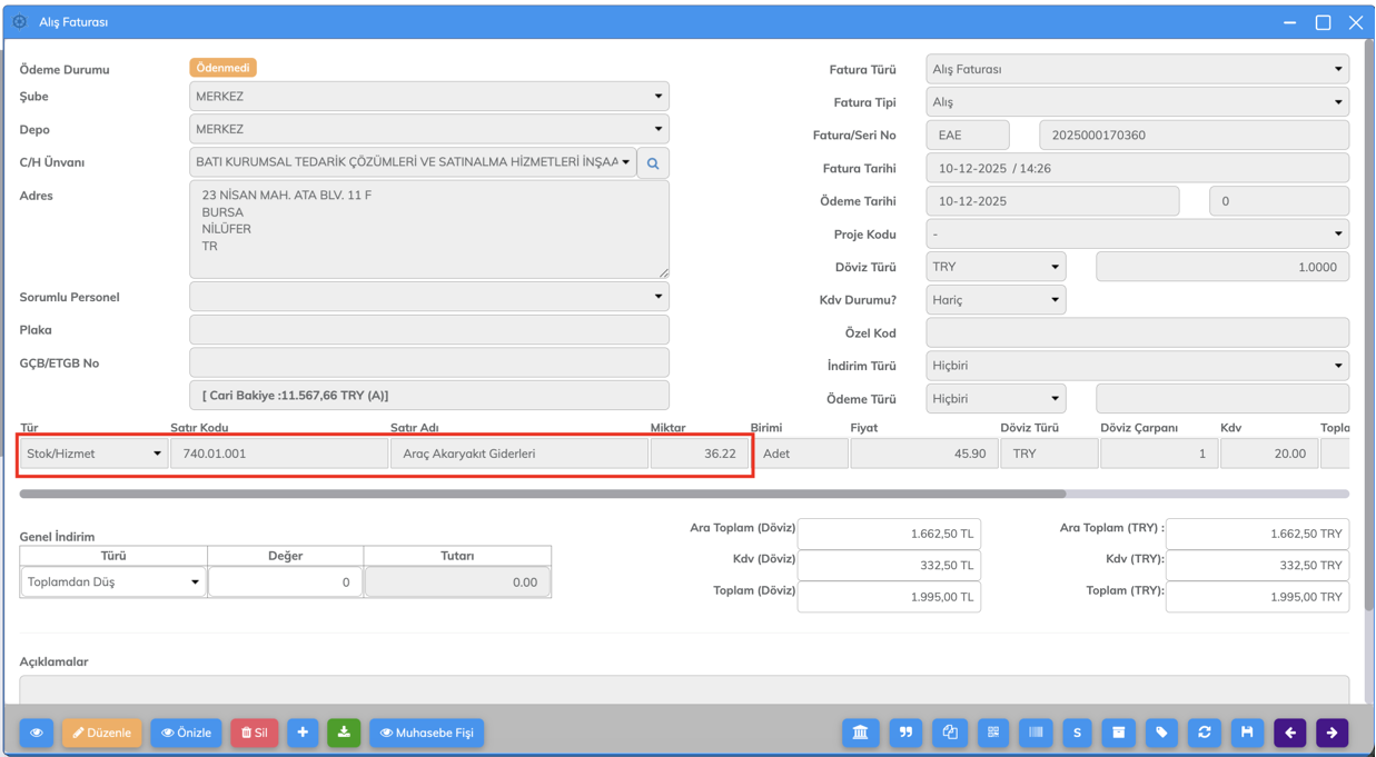 Tanımlama tamamlandıktan sonra, Alış Faturası satırlarında bu hizmet kartı seçildiğinde ve fatura kaydedildiğinde;