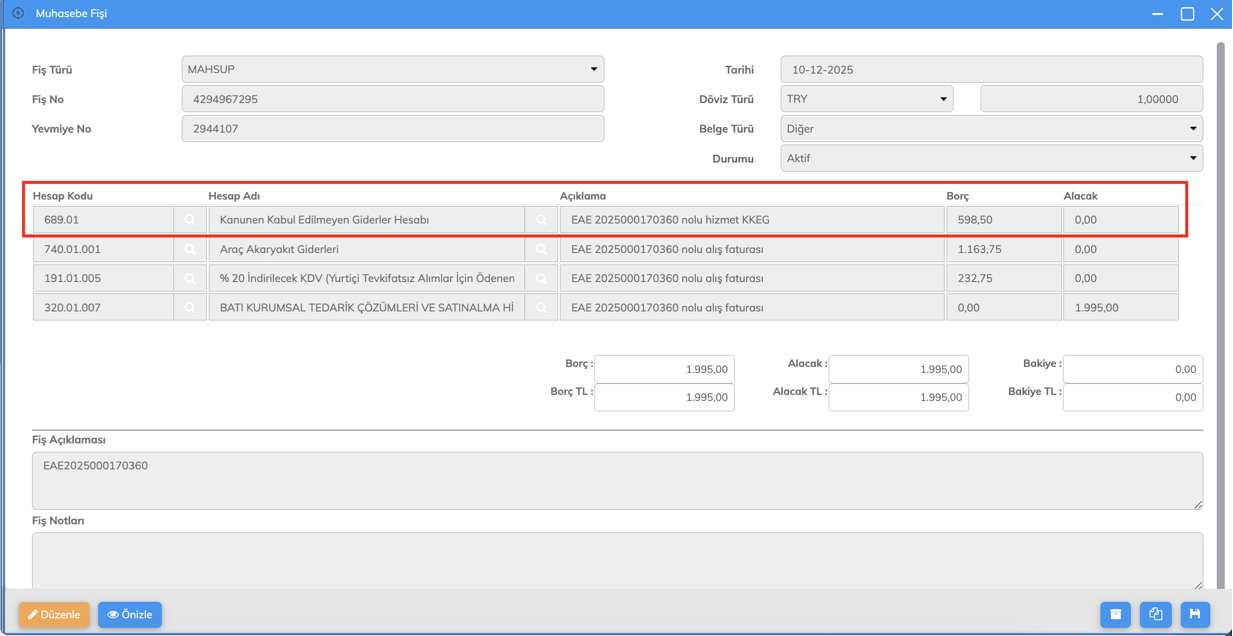 KKEG tutarının ayrı bir satır olarak muhasebeleştirildiği görülecektir.